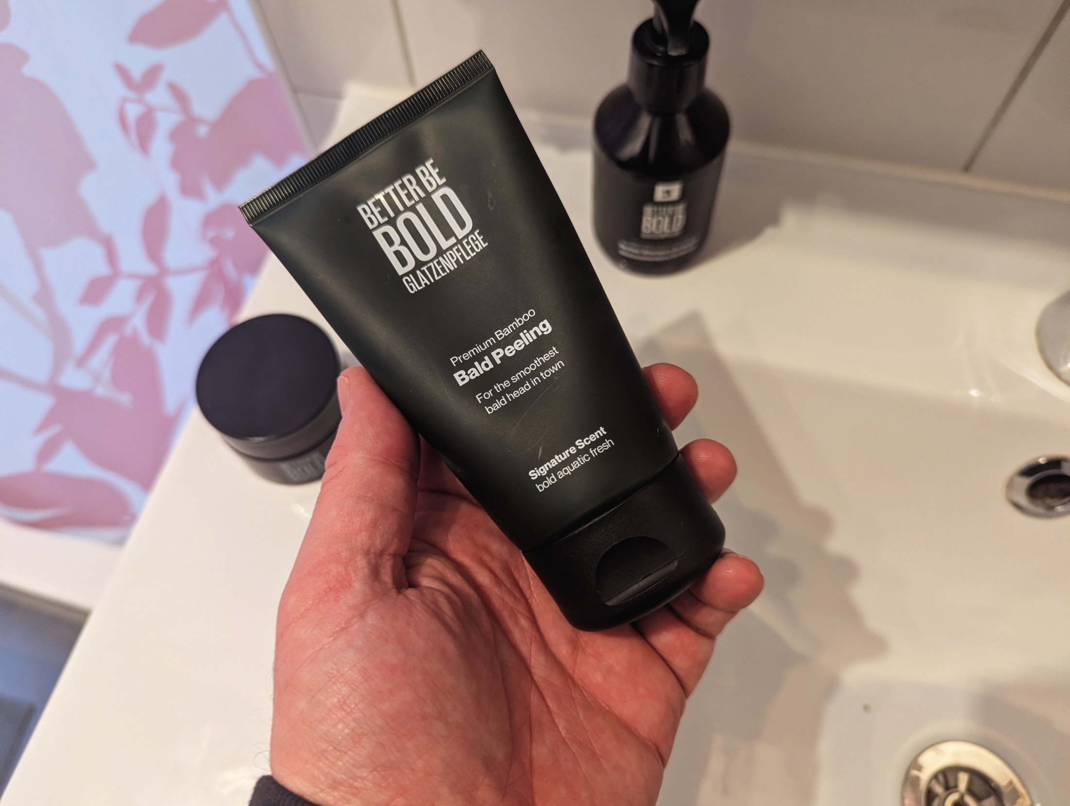 In Kombination mit den anderen Pflegeprodukten wie der Better Be Bold Glatzencreme, dem Glatzenshampoo, dem neuen Glatzenpeeling mit Bambusfasern oder der überaus wichtigen Glatzenpflege mit UV-Schutz bekommt Ihr eine wirklich außerordentliche Pflegereihe, die perfekt für Glatzenträger ist. Ich liebe sie einfach.