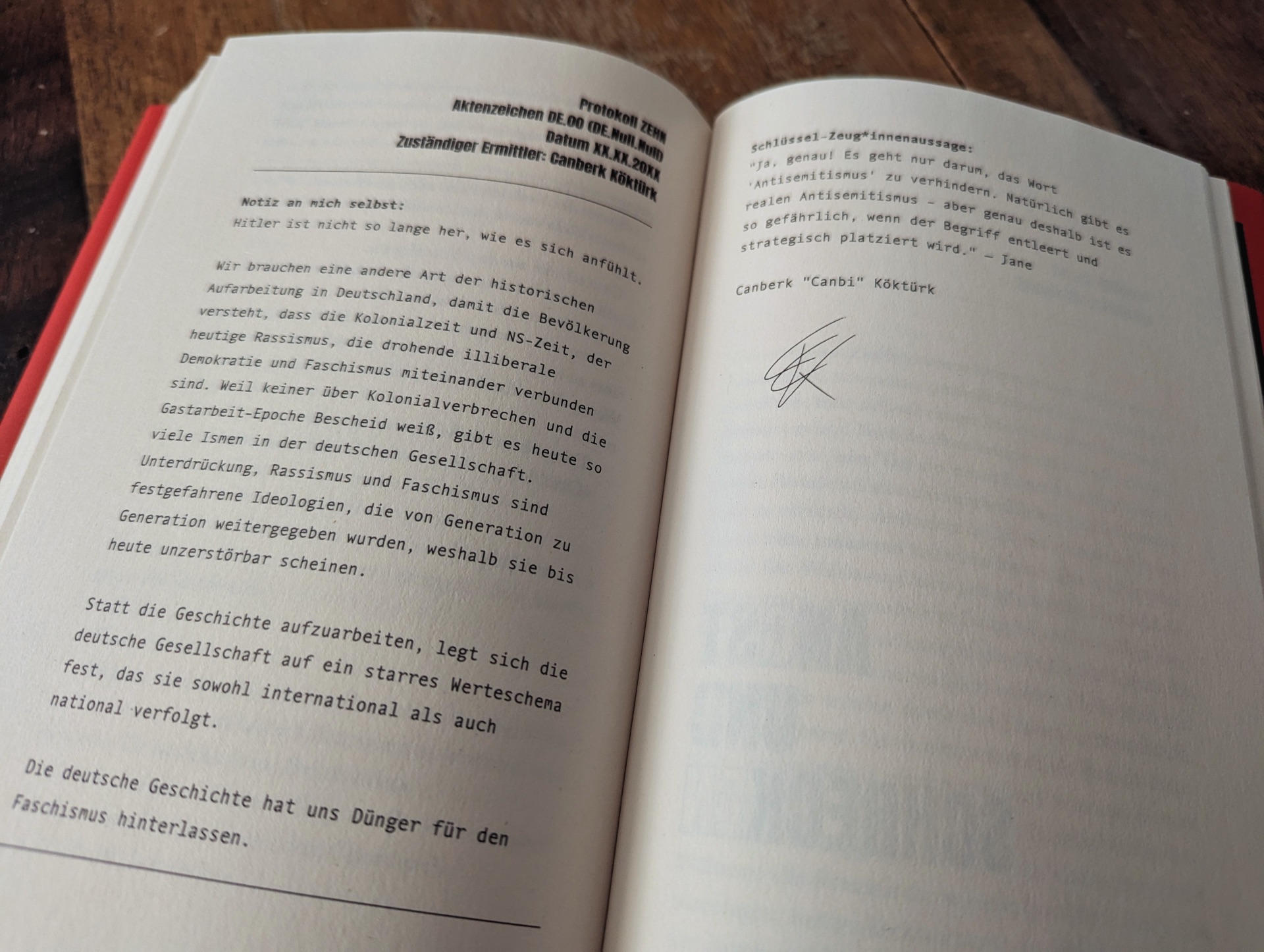 Canberk Köktürk spricht mit Betroffenen, sammelt Indizien und trägt Wissen von unterschiedlichsten Menschen zusammen. Gerade die Erfahrungen von Menschen mit Migrationshintergrund, insbesondere die Ängste und Bedrohungen, werden in “Fascholand” sehr anschaulich dargestellt, in Kombination mit Köktürks beißendem Humor ist liest sich dies wirklich wunderbar.